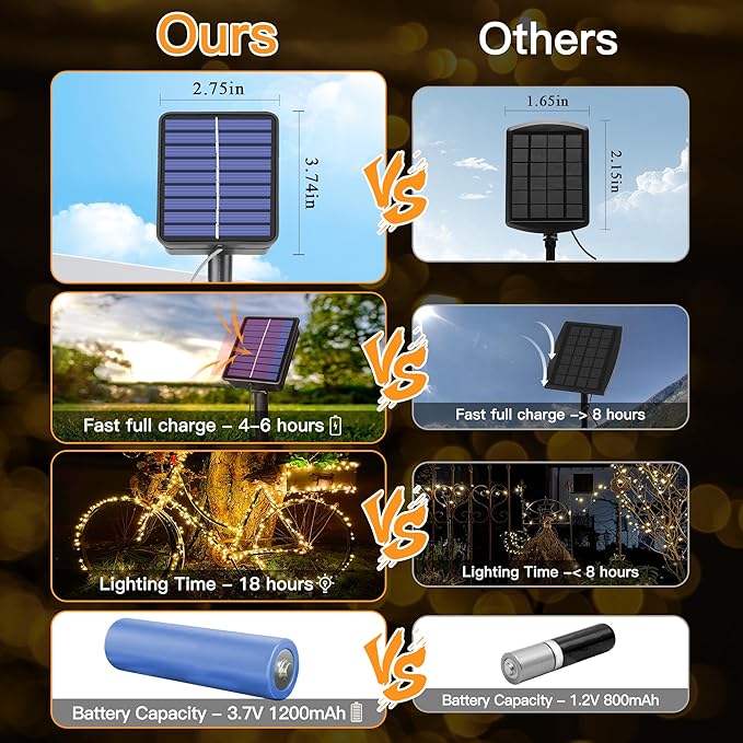 - 【Fast Charging Long Lasting】The outdoor string lights equipped with an 1200mAh rechargeable battery that can be quickly fully charged within 6 hours. Once charged, the lights can shine for about 18 hours. The lights are also equipped with a built-in sensor that automatically turns them on at dusk and off at dawn, making them more efficient and convenient to use