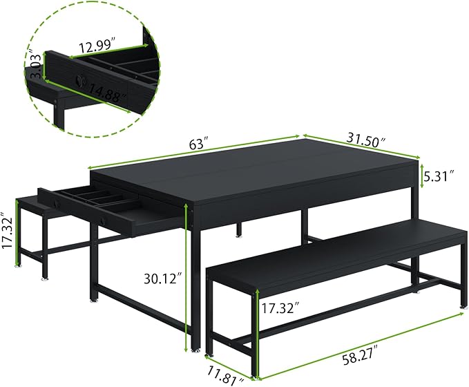 - 【Black 3-Piece Dining Set for 4-6】Elevate your dining space with Loomie charming 3-piece Black dining set, featuring a rectangular table and two benches. This complete dining ensemble offers a generously sized table (63” L x 31.5” D x 29.92” H) and two benches (58.27” W x 11.81” D x 17.32” H each), perfect for gatherings of 4-6. Experience cozy meals and stylish gatherings with this tastefully designed dining set.