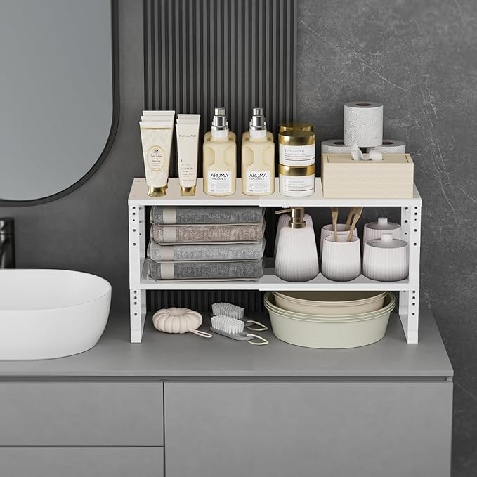- ⭐【Expandable Size】Expandable length (10.04"D x 16.54"~26.38"W x 6.22~7.48"H).The extendable&stackable function used as kitchen cabinet shelf or expandable counter shelf organizer.It can function as a single or be separated into two/three racks, offers a tidy solution for your kitchen.