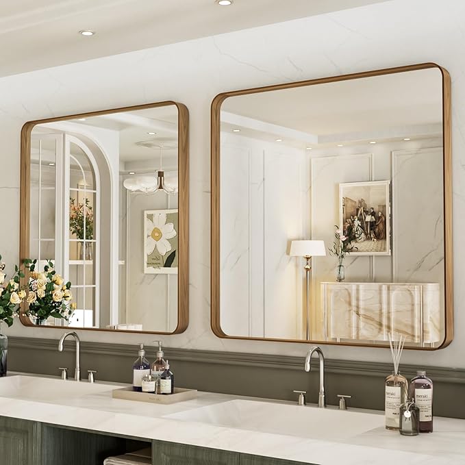 LOAAO 38X38 Inch Bathroom Mirror with Wood Grain Colored Metal Frame, Rounded Rectangle Metal Framed Bathroom Mirror, Anti-Rust, Hangs Horizontally or Vertically, Tempered Glass