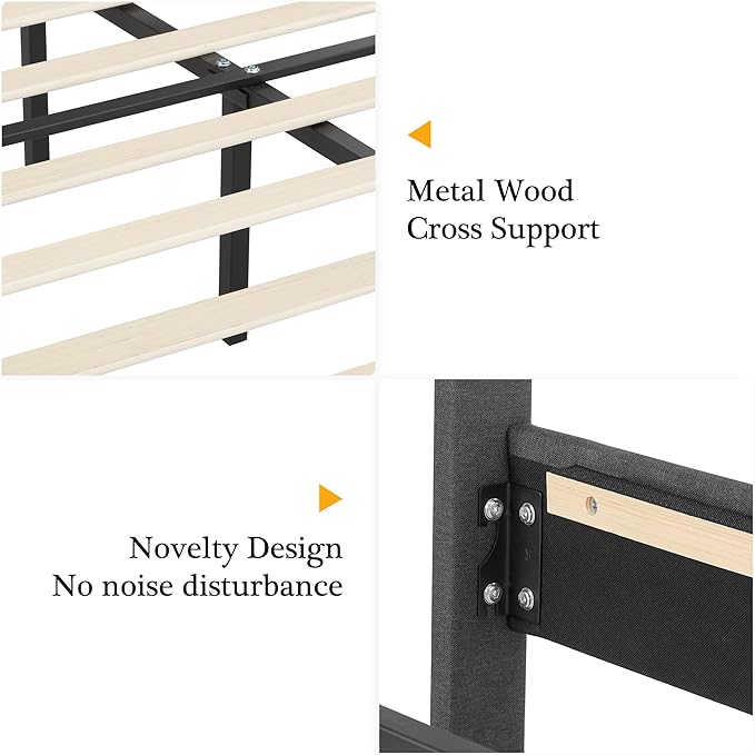 - 【Noise Free Structure】Equiped with extra quiet straps on the queen bed frame, this can effectively reduces noise and rattles, so you can enjoy every quiet &comfortable night. 8" under-bed space is perfect for storing shoes, small storage boxes and more.