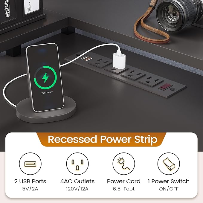 - 【User Friendly】The L shaped computer desk includes a built-in power strip with 4 outlets & 2 USB Ports provides convenience for charging your gaming gear, tablet、printer or phone.Don't worry about not having enough power sockets. Also includes an on-off switch, thanks to the on-off switch, one-button power off to ensure safe electricity use, which strengthens security.