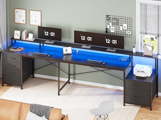 SEDETA L Shaped Desk with 6 Drawer, 108" Home Office Desk with File Drawer & Power Outlet, Corner Computer Desk with Monitor Shelf, File Cabinet, Two Person Desk, Gaming Desk with Led Lights, Black
