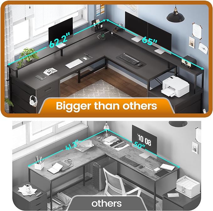 - 【Ideal Space】This computer desk has a spacious desktop. The desktop size is 65"L*19"W and 62.2"L*19"W or 108 inch two person desk. The printer rack can be used for printers of any size commonly seen on the market. The L shaped computer desk could hold three desktop computers and one notebook computer. This computer desk can also be freely deformed into a long square or L-shaped desk according to your use needs.