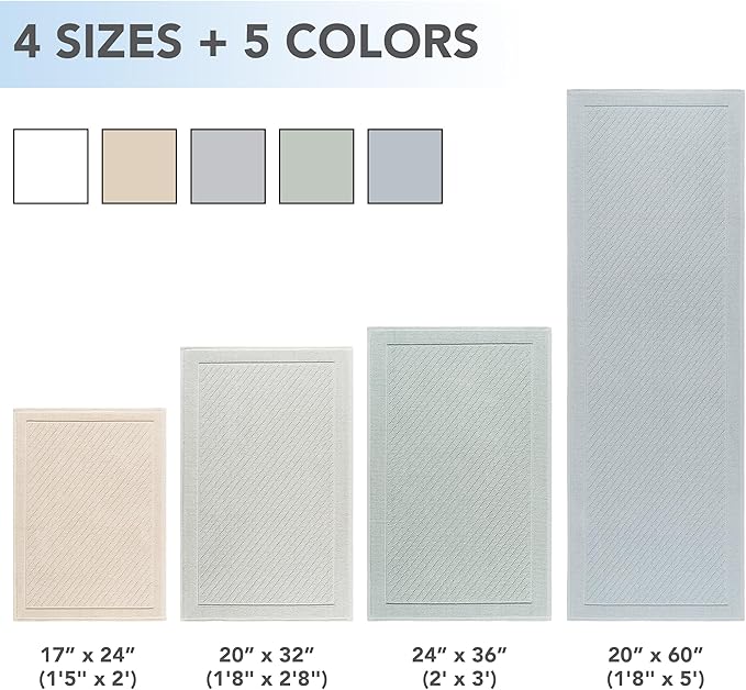 - MODERN BATH DECOR: Transform your home's style and comfort level with our durable woven cotton bath rugs and mats. This contemporary collection boasts 5 elegant colors, featuring tightly woven construction for longevity. Elevate your bathroom with these inviting bath mats and rugs. The spa-inspired palette offers Pearl White, soft grey, soothing eucalyptus green, creamy beige, and gentle baby blue. The fresh colors and distinctive multi-directional texture add charm to your bath decor.