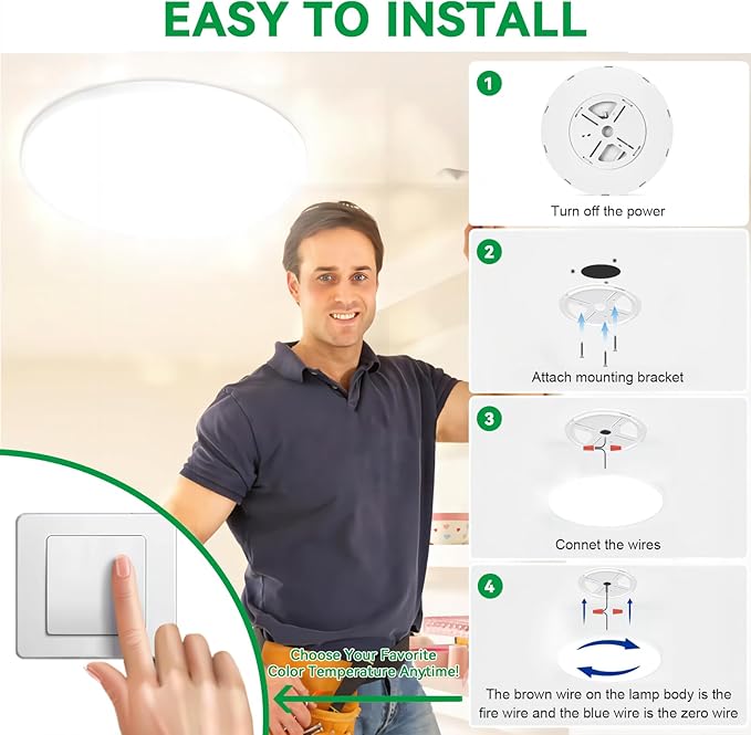 - Upgraded Easy Installation: 4 easy steps to install the flush mount ceiling light. Fixate the canopy with screws, connect the wires, screw tight the LED light. All accessories needed and instructions are included in the package. The brown wire on the lamp body is the fire wire and the blue wire is the zero wire. NO MORE PERFORATION Needed