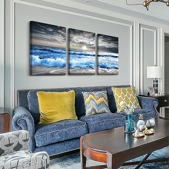 MHARTK66 Large Canvas Wall Art for Living Room, Bedroom, Office Decor - Blue Ocean Wave Seascape Pictures, Black and White Beach Painting - Modern Home Decorations