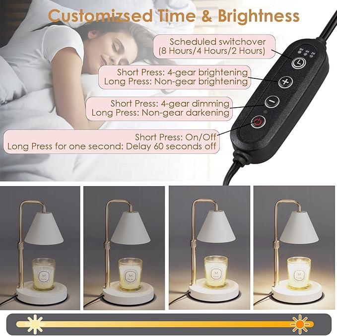 - 【CANDLE LAMPS WITH TIMER AND DIMMER】:This candle burner lamp will take you to enjoy the comfortable aroma atmosphere,it has 2 h,4 h,8 h of time Settings,but also adjust the brightness of the lamp to achieve your desired melting speed,can be very pleasant to work in the aroma atmosphere.You don't need to buy light bulbs,there are 2 for you.