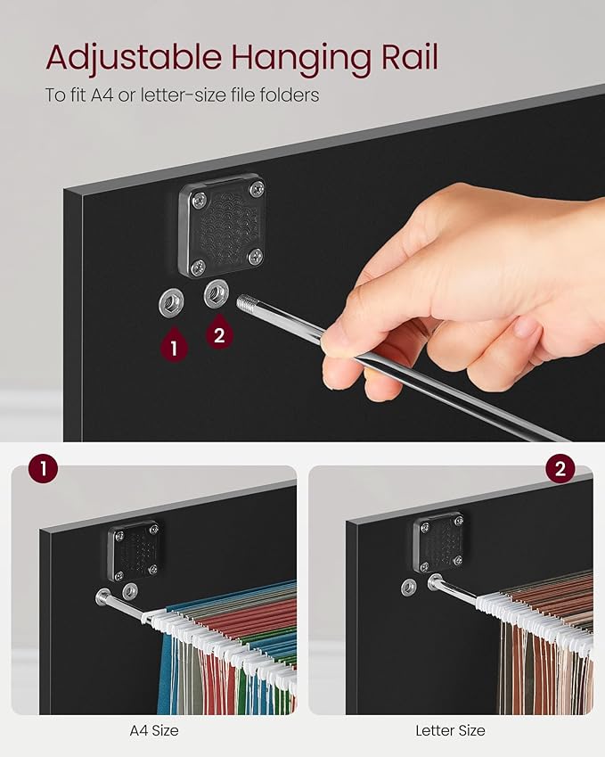 - [Fit A4 and Letter-Size File Folders] You can adjust the position of the hanging rail in each of the 2 file drawers to hang A4 or letter-size file folders horizontally for easy access