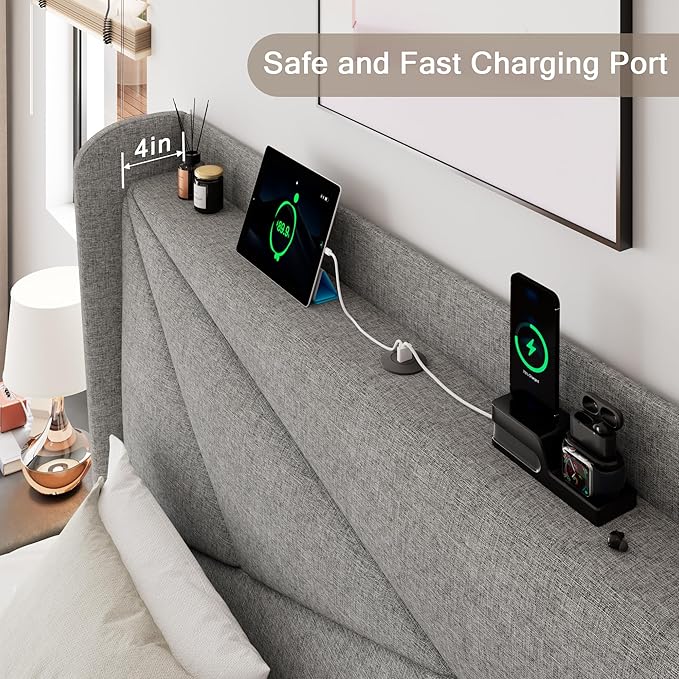 Full Size Upholstered Bed Frame with Charging Station, Platform Bed Frame with Storage Headboard, Solid Wood Slats Support, No Box Spring Needed, Light Gray