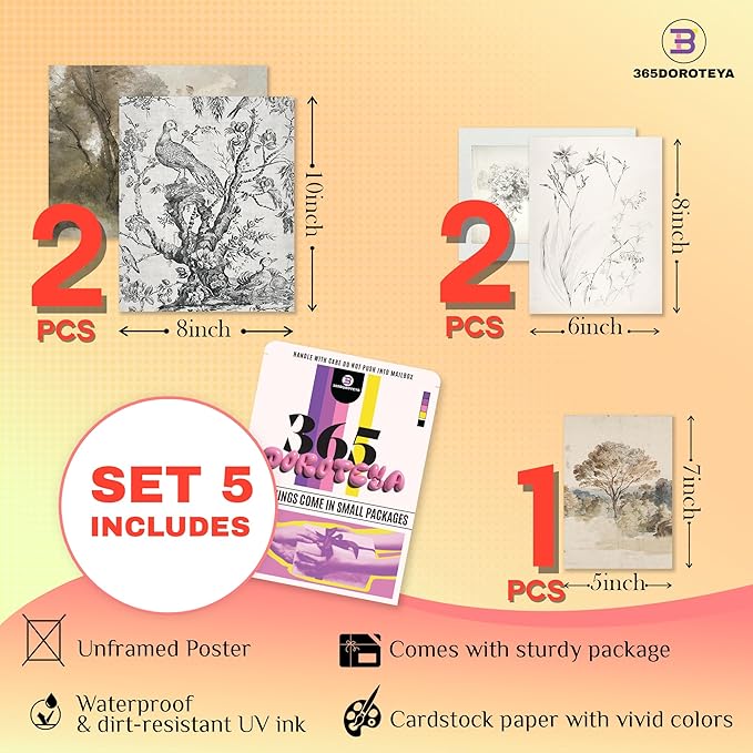 - Our set of 5 pcs wall art come in standard sizes: 1 pcs 5"x7", 2 pcs 6"x8" and 2 pcs 8"x10", making them easy to frame and display on your walls as soon as they arrive. Transform your walls into an art gallery with our collection of high-quality prints and posters that will elevate your space and bring it to life