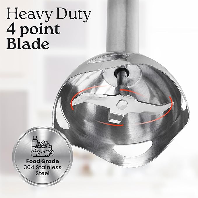 - POWERFUL AND DURABLE: This immersion blender, designed with a full-bodied, 800-watt copper motor, can quickly and effortlessly blend ingredients. The 304 stainless steel blade is rust and corrosion-resistant, making it ideal for long-term use. The heavy-duty yet compact design of this immersion blender handheld makes this hand blender ideal for mixing bowls, pots, pans, and beakers.