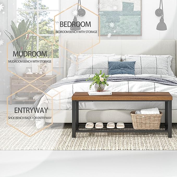 FOLUBAN Modern Entryway Bench - Rustic Wood and Metal Shoe Storage for Hallway Front Door Entrance, Industrial Indoor Seat for Bedroom Living Room, 43 Inch Walnut