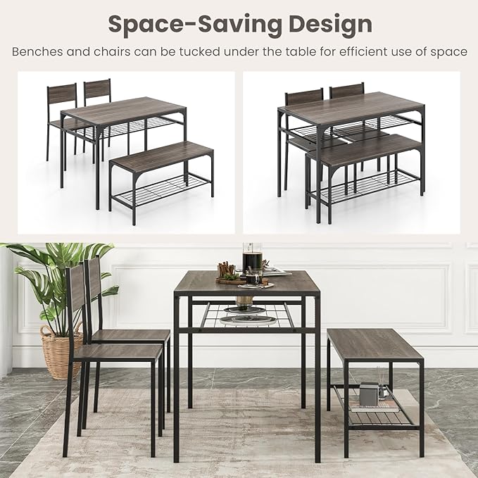 Tangkula Dining Table Set for 4, Kitchen Table and 2 Chairs for 4 with Bench, Additonal Storage Rack, 4 Piece Dining Table Set for Small Space, Apartment