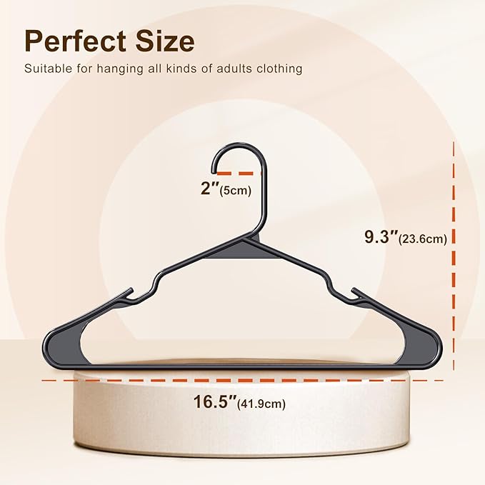 - Standard Hangers for Adult - Black hangers 16 pack with ideal dimensions each: 16.5"x 9.3" x 1/4". Thin hangers have no burrs or flashes, which can protect you delicate clothes. The smooth finish of the dress hangers keeps your elegant clothes safe from any damages, creases or marks