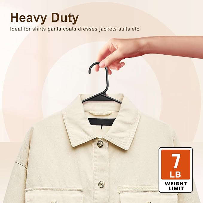 - Heavy Duty Clothes Hangers - Made from eco-friendly durable plastic, these clothing hangers will last for years. The neck and corners are reinforced to provide better support for your clothes, so it's stronger than other clothes hangers plastic, our closet hangers holds up to 8lbs like the heavy coats and jeans also most of your clothes