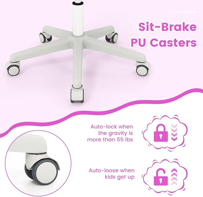 - 【Swivel Seat & Sit-Brake Wheels】 The seat can swivel 360°, enabling kids to change directions for easy reach. 5 sit-brake wheels will auto-lock when the gravity is more than 55 lbs and auto-loose when kids get up. To ensure safety, kids can not move the swivel task chair when the wheels are locked. And the PU wheels won’t damage the floor.