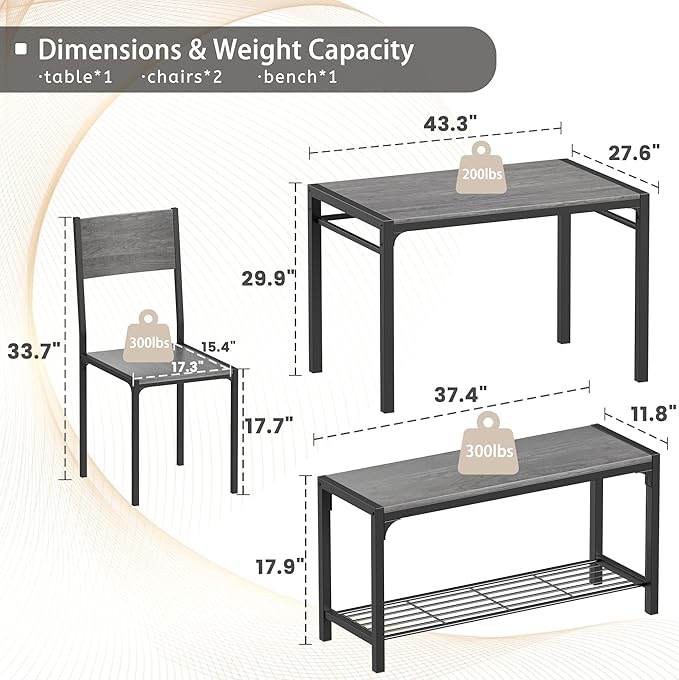 - Dining Table Set for 4 - Table size: 43.3"(L)*27.6(W)*29.9(H), Capacity: 200 lbs; Chairs size: 17.3"(L)*15.4(W)*33.7(H), Capacity: 300 lbs; Bench size: 37.4"(L)*11.8(W)*17.9(H), Capacity: 300 lbs.