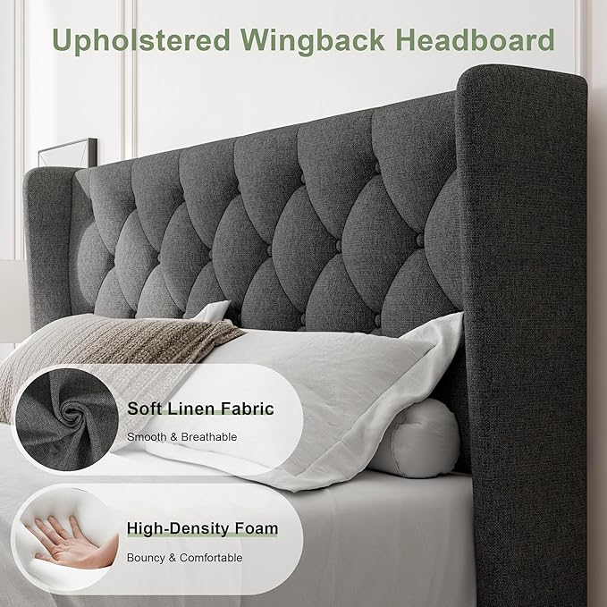 - Elegant Wingback Design: Featuring a sophisticated wingback headboard with classic button tufting, this bed frame adds a touch of luxury to any bedroom while blending seamlessly with various decor styles