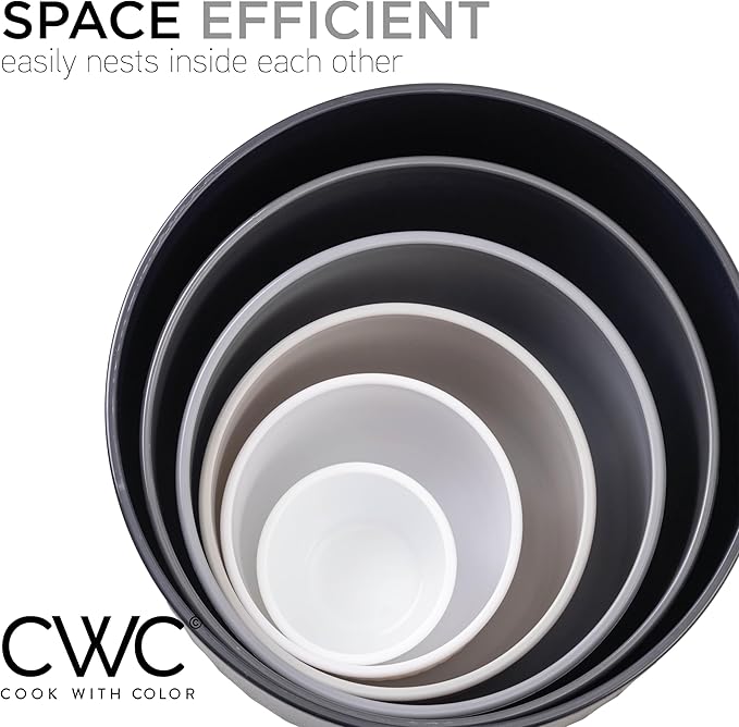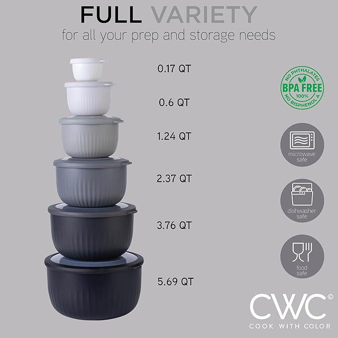 - Cook with Color 12 piece plastic mixing bowl set - non slip bowls with lids; easy to clean, sturdy mixing bowls.