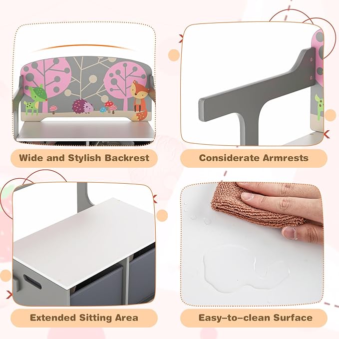 - 【Easy Assembly & Maintenance】The wooden children storage bench will come with clear instruction and all necessary parts, which help a lot for assembly. More importantly, the easy-to-clean surface makes daily maintenance a breeze. Certified by ASTM and CPSIA, this 3-in-1 convertible activity bench is more reliable.