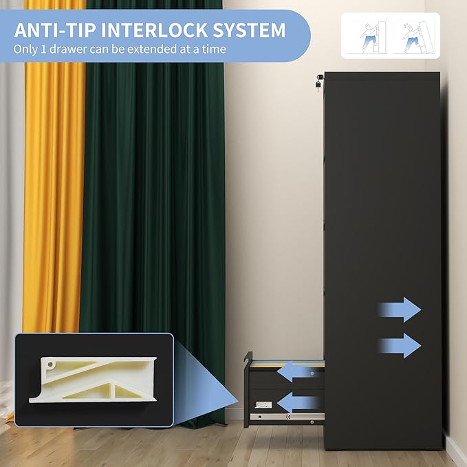 - ◉【Lockable & Secure】The black 5 drawer filing cabinet features a locking mechanism with interlock systems that secure all drawers simultaneously, enhancing the security of your documents. The anti-tilt system prevents tipping when multiple drawers are open, ensuring your safety.