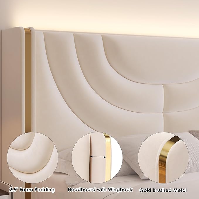 HITHOS Queen Upholstered LED Bed Frame with 2 Storage Drawers, Velvet Platform Bed with Wingback Headboard, Solid Wooden Slats Support, No Box Spring Needed, Headboard Splicing Design, Beige