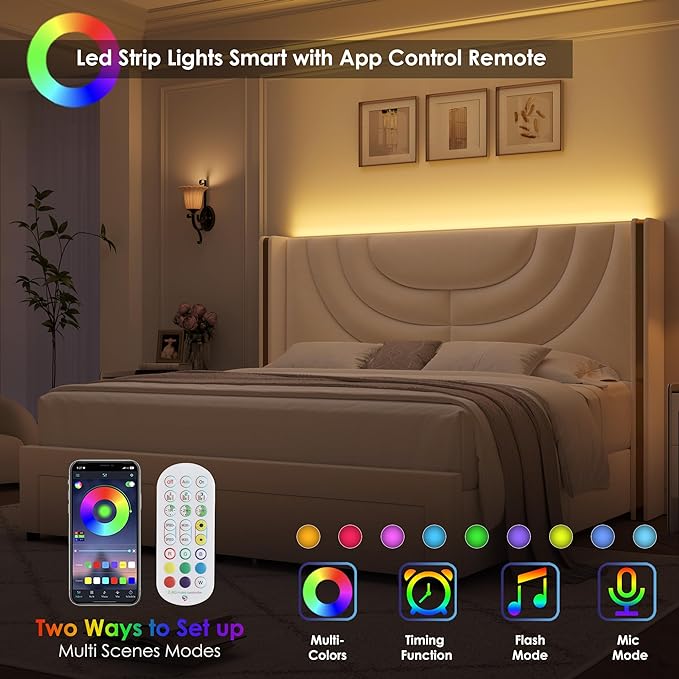 - Built-in LED Light Bed Frame: The RGB LED lights built in the top of headboard make it practical and unique. These high-quality lights are super bright, available in multiple colors or single color options, featuring various settings and brightness levels. The bed frame light can be set using a remote control or an app, creating a beautiful ambiance in your bedroom