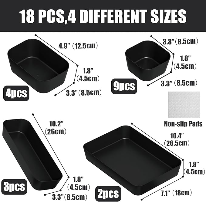 - 【Multiple Sizes】18pcs customizable drawer bins includes 4 sizes: 3.3" x 3.3" x 1.8" (9 pcs), 4.9" x 3.3" x 1.8" (4 pcs), 10.2" x 3.3" x 1.8" (3 pcs), 10.4" x 7.1" x 1.8" (2 pcs), you can customize the combinations, It’s easy to find a configuration that works for your drawers or desktop.