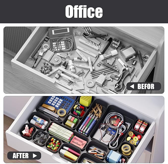 - 【Multifunctional】These versatile drawer dividers trays are suitable for various locations in your home, which can be makeup organizer for vanity, junk drawer organizer, drawer organizer tray, bathroom drawer organizer and office organizer. It can be used to organize cosmetics, makeup tools, hair accessories, jewelry, pins, office supplies, craft materials, utensils, and more.