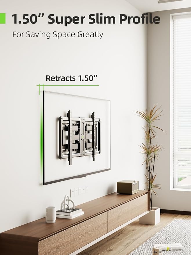 - Space Saving: Super slim wall mount places TV just 1.5'' from the wall when fully retracted, which narrows the gap between TV and the wall and greatly saves space. In addition, mount can extend up to 11.97'' for easy cable access and closer viewing angle