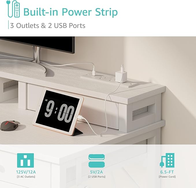 - Safety Multi-functional Power Strip: The computer desk includes a built-in power strip with 3 power outlets & 2 USB charging ports for your computer, monitor, gaming gear, pad, phone and other electronic devices.