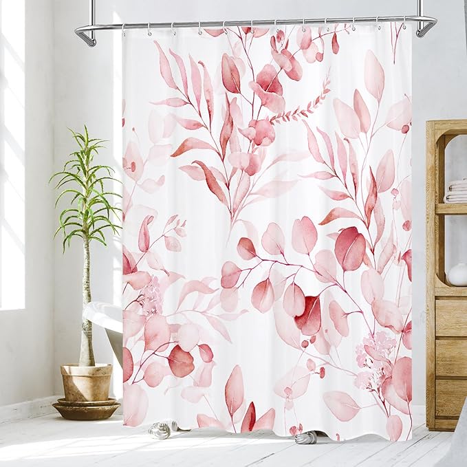MitoVilla Pink Spring Floral Shower Curtain, Modern Plants Botanical Fabric Cloth Shower Curtains for Chic Elegant Bathroom Decor, Summer Watercolor Eucalyptus Leaf, 72x72