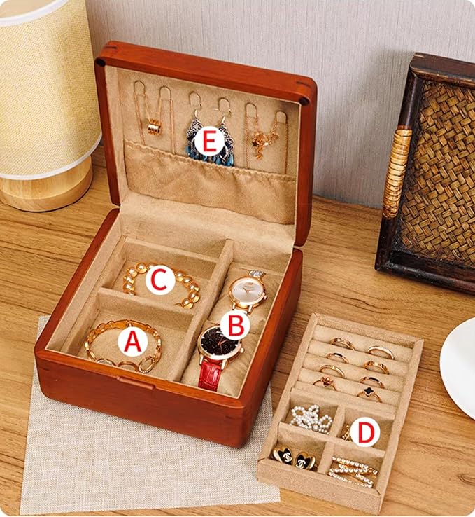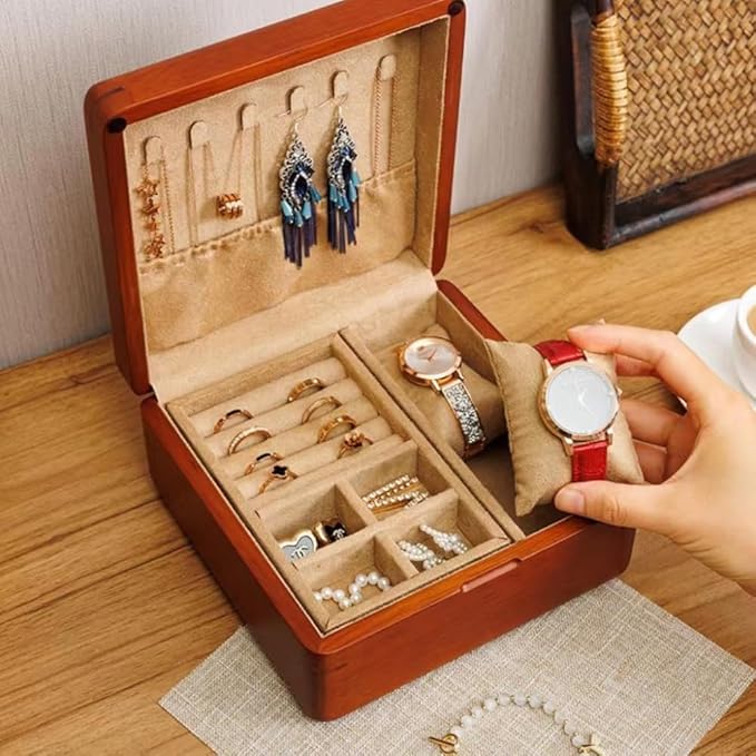Bescott 2 Layer Solid Wooden Jewelry Box for Women Real Wood Vintage Jewelry Organizer Storage for Earrings Rings Necklaces Bracelet Watch Men