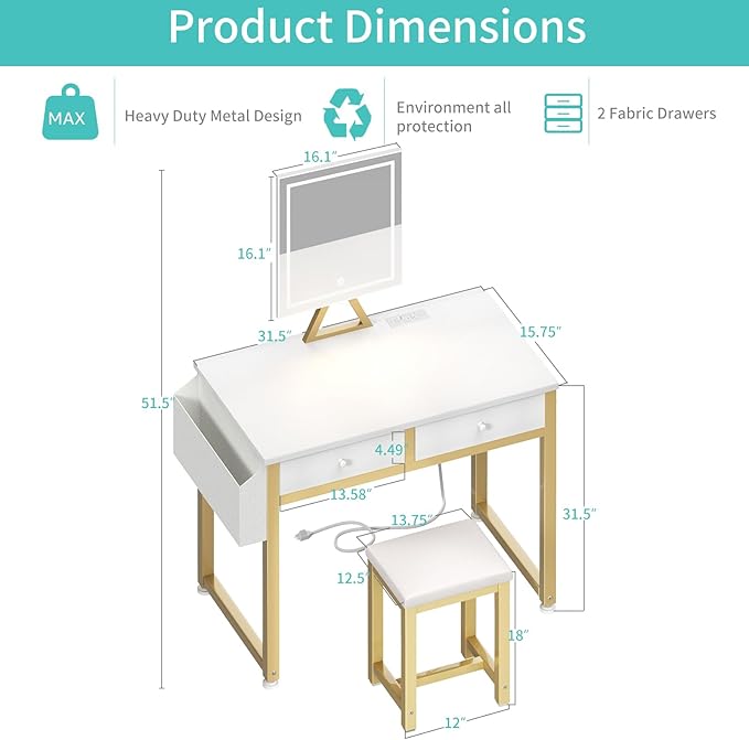 Lufeiya Small Makeup Vanity Desk with Mirror and Light, 32 inch White Vanity Desks Sets with Fabric Drawers for Girls Teen, Dressing Table and Chair Set with Power Outlet for Bedroom, White Gold