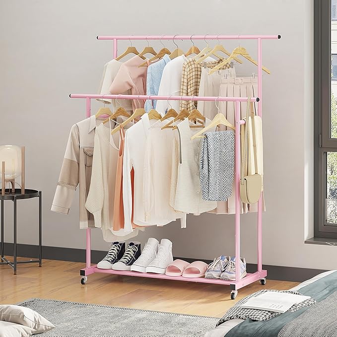 Calmootey Double Rod Clothing Garment Rack,Rolling Hanging Clothes Rack,Portable Clothes Organizer for Bedroom,Living Room,Clothing Store,Pink