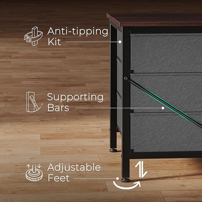 - 【Sturdy, Safe and Stable】Crafted from high-quality fabric, a durable wooden top, a robust metal frame and easy-to-pull handles, this dresser TV stand brings longevity while being lightweight to move. Drawers glide smoothly for easy access even to little kids. With anti-tip kits included, it's child-friendly and ensures this clothes dresser stays securely in place. The 8 adjustable feet keep it stable on uneven surfaces and safeguard your floors from scratches