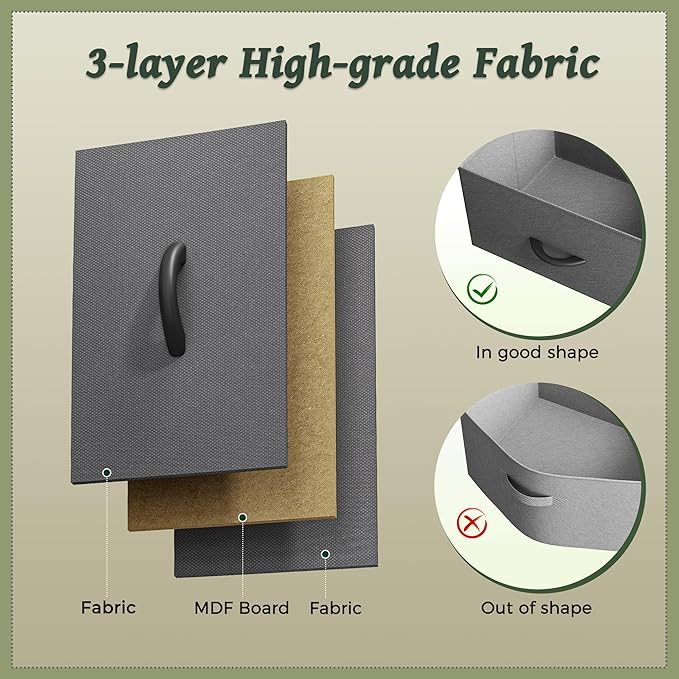 - 【Easy Assembly】No need to stress about setup! Our fabric dressers for bedroom includes all parts and detailed instructions for hassle-free assembly. You'll have it ready to use within 30 minutes, ensuring a smooth experience from start to finish. Crafted with high-quality fabric, a durable wooden top, a robust metal frame and solid P2 Particle Board. Thickness of P2 Particle Board: 12mm; Thickness of Steel Tube: 15mm