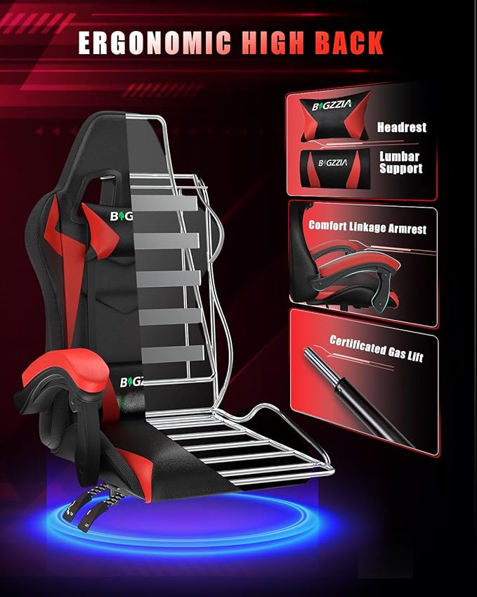 Bigzzia Gaming Chair with RGB LED Lights, High Back Ergonomic Computer Gamer Chair with Headrest and Lumbar Support, Racing Style Reclining Game Chair for Adults, Kids(Black/Red)