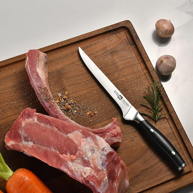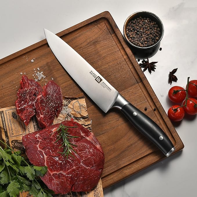 - 【Forged Full-Tang Construction】The knife's full tang construction extends the blade into the handle, enhancing leverage and balance. Its solid, curved bolster provides excellent grip and control, increasing safety and handling precision.