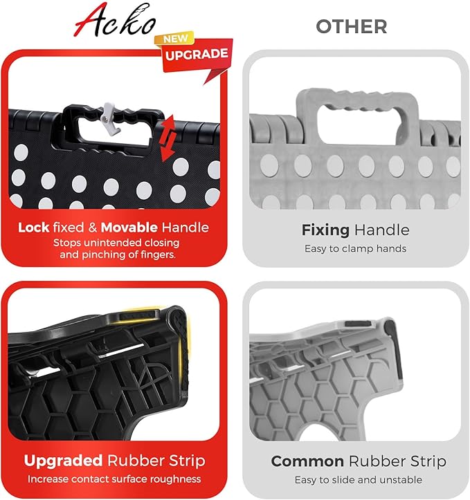 - Safety-Focused Design: Our lightweight folding step stool equipped with a non-slip surface, movable handle and the bottom corners are upgraded to black non-slip dot textured rubber straps to prevent slips and finger traps, improving a secure user experience.