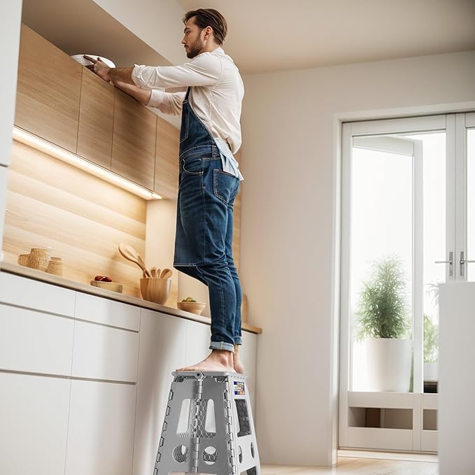 - Safety-Focused Design: Our lightweight folding step stool equipped with a non-slip surface, movable handle and the bottom corners are upgraded to black non-slip dot textured rubber straps to prevent slips and finger traps, improving a secure user experience.