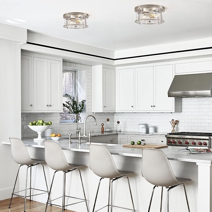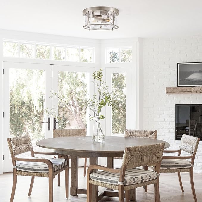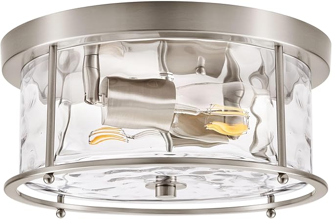 LamQee Flush Mount Ceiling Light with Clear Hammered Glass, Industrial 2-Lights Farmhouse Close to Ceiling Light Fixtures Round Low Profile Lights for Kitchen Hallway Foyer Entrance Bedroom Nickel