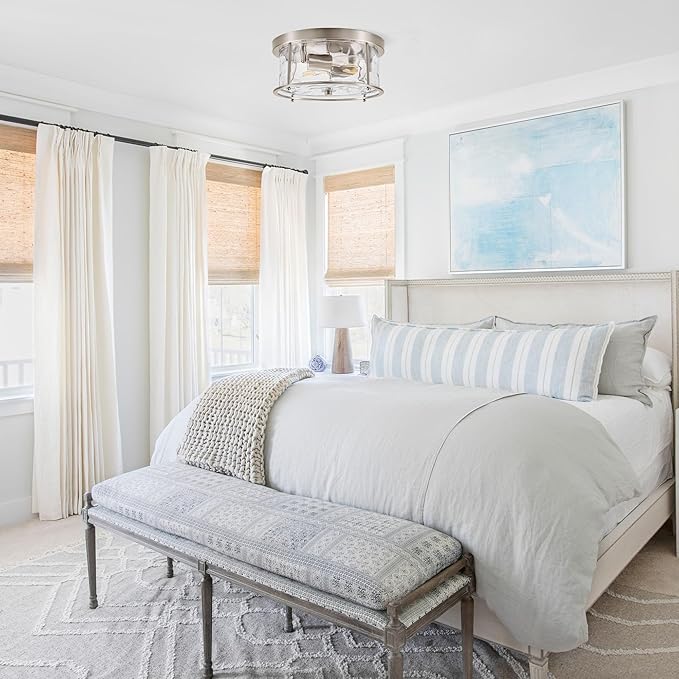 - Modern Design: This flush mount ceiling light is made of clear hammered glass with a delicate outer metal frame; and they have different colors such as black, brushed gold, brushed nickel and rustic white, to adapt variety of home styles such as modern, farmhouse, simple and industrial; the bulb is 2-lights, the light passes through the hammered glass, the reflection leaves on the wall and the starburst pattern forms on the ceiling, creating bright, unique, elegant and warm effect