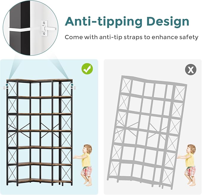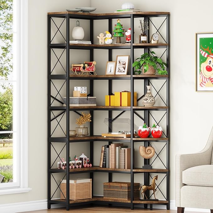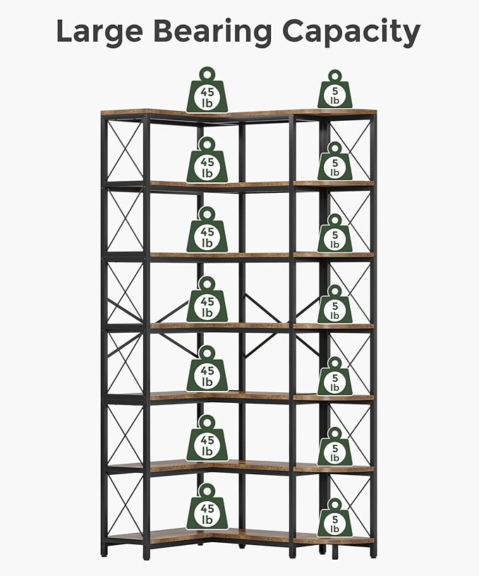 7-Shelf Reversible Corner Bookshelf, Modern Industrial Tall Bookcase, 7-Tier Large L-Shaped Storage Shelf Display Rack with Metal Frame for Living Room, Home Office, Bedroom, Rustic Brown
