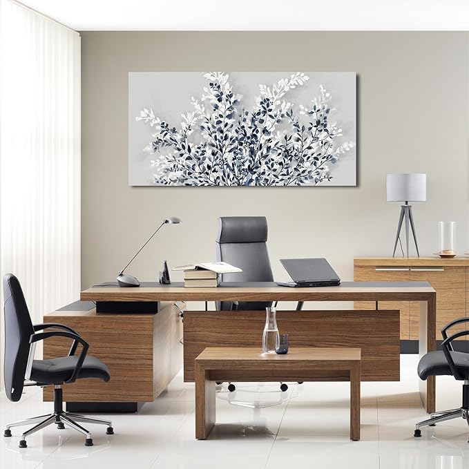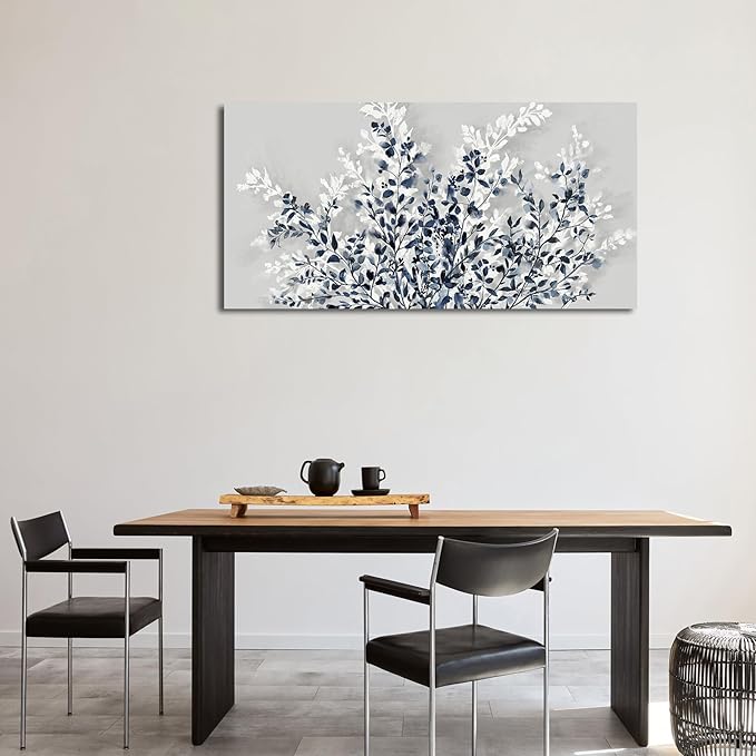 NINEASO Botanical Flowers Wall Art - Indigo Blue and White Floral Canvas Pictures Spring Blooming Painting Gray Background Printing Artwork Living Room Bedroom Home Office Wall Decor 24" x 48"