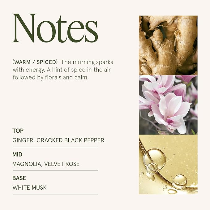 - Ginger and White Musk: A blend of ginger and lemongrass, with a spicy kick of black pepper, blossoms into a lush bouquet. It settles into a warm embrace of ambrox, fresh cedar, and white musk perfect for fall transitions, reset moments, or light, uplifting ambiance.