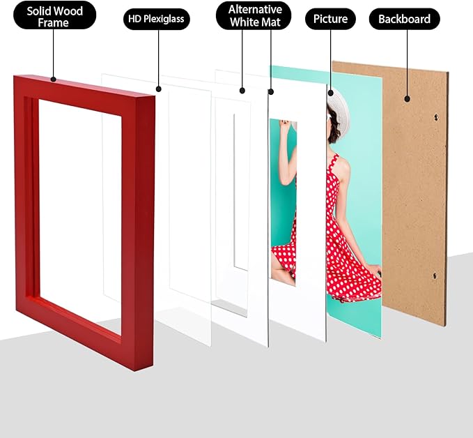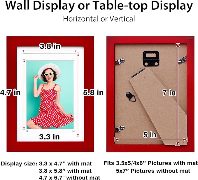 - SOLID WOOD: Kinlink wooden 5x7 photo frames are fitting for standard pictures 3.5x5/4x6 with mat and standard pictures 5x7 without mat. These red 5x7 frame matted 3.5x5 are made of light weight solid wood, with transparent, non-toxic acrylic glass front that gives a clear view of your pictures and preserves your precious memories as well. It is worth noticing that remove the protective film on the glass before use.