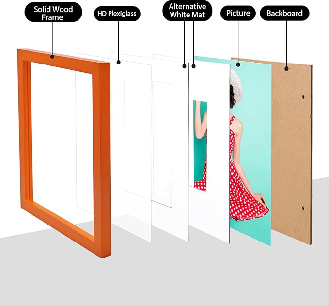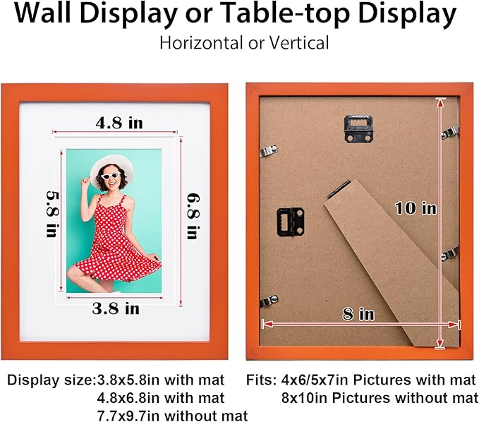 - ATTRATIVE DESIGN: The orange 8x10 picture frame with mat smooth wood grain lines can almost complement any decorative styles. The simple outlook combined with exquisite details, which is suitable for highlighting your valuable memorable times.