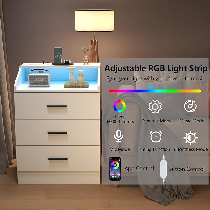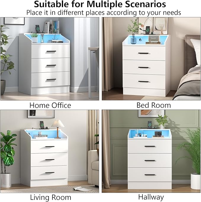 - 【White Dresser with LED Lights】This chest of drawers is equipped with multi-color RGB LED light strips, the colors, and brightness can be freely adjusted through the button and App, making your furniture more diverse and stylish. Moreover, the light colors can be changed with the rhythm of the songs, and the App also has a timer setting so you can set the time to control the lighting on or off according to your needs.